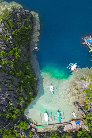 From above in El Nido, Philippines, this image reveals a lagoon shaped by limestone cliffs and shallow reefs. Seen from a top-down perspective, the colors, boats, and contours form a natural pattern that’s often hidden from view.